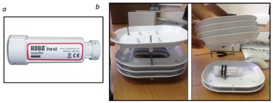 (a) Weatherproof HOBO data loggers suitable for the outdoor environment, (b) radiation shields in which the loggers were placed and (c) mounting of the radiation shields at each one of the four study areas.