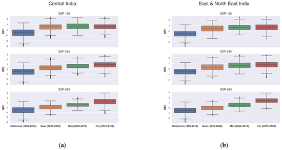 CMIP6 SSP scenarios 12-month Standard Precipitation Index (SPI) boxplot at homogeneous region level (a) Central India, (b) East and Northeast India, (c) Northwest India, and (d) South Peninsula India for near, mid, and far future.