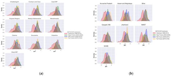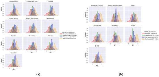 A main monsoon core region, the Central India homogeneous region’s SPI index median is most likely to shift towards the wet side with some extreme wet events and moderate to severe dry events in the near future under SSP-126, SSP-245, and SSP585 scenarios (Figure 9a, Figure 10a, Figure 11a, and Figure 12a). If we drill down to the subdivision level, the frequency of occurrence of dry events (Figure 13) is likely to be moderate to severe drought frequency in the near future under the SSP-126 climatic scenario which is also likely to decrease in the mid and far future. Wet event frequency is comparatively high for West MP in the near future under the SSP126 scenarios (Figure 14). The wet frequency is likely to increase with extreme SSP scenarios in the mid and far future for all subdivisions of Central India. The East and Northeast India homogeneous regions are also in line with the Central India region and are likely to increase in wet event frequency in the mid and far future. The PDF plot (Figure 10, Figure 11 and Figure 12) shows the more erratic SPI index distribution with the extreme SSP scenarios for the mid and far future.