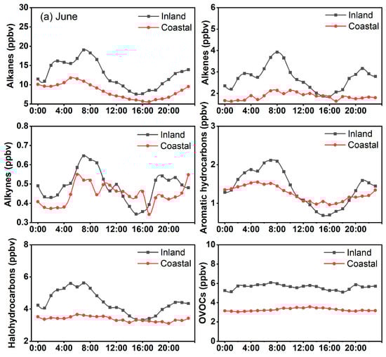 Figure 3 shows the diurnal variations of VOC concentrations in coastal and inland cities during June and December 2021. The concentrations of alkanes, alkenes, alkynes, aromatic hydrocarbons, and halohydrocarbons exhibited a decreasing trend during the daytime and an accumulating trend during the nighttime. In contrast, OVOC concentrations showed an opposite diurnal variation. During the daytime, the atmospheric oxidation capacity increases with increasing temperature and solar radiation, which facilitates photochemical reactions that produce OVOCs while enhancing the consumption of other groups of VOCs [11]. At night, the decrease in planetary boundary layer height caused the accumulation of VOC concentrations. Further, it is noteworthy that the diurnal variation for most groups of VOC concentration exhibits double-peak patterns (e.g., at 6:00–8:00 and 19:00–21:00). Compared to inland cities, the peaks of VOCs in the coastal city occurred about a hour earlier. In winter, the daily variation of the same group of VOCs is similar, but its peaks occur about two hours later than those in summer. This pattern has also been observed in other areas [27]. This phenomenon is influenced by local traffic emissions and planetary boundary layer height changes. The planetary boundary layer state is influenced by the temperature and humidity conditions [28]. Stable boundary layers can develop at nighttime, particularly in winter, which causes pollutants to accumulate [29]. This is possibly due to the fact that the convective boundary layer tends to appear earlier in coastal areas than inland and later in winter than in summer. The concentrations of alkenes and alkynes in coastal areas during summer showed similar diurnal variations, showing several concentration peaks during the daytime (e.g., at 8:00, 10:00, 13:00, and 16:00). This pattern indicates that alkenes and alkynes might originate from the same sources.