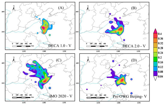 The PSCF results showed that V might distributed in Qingdao and the surrounding coastal areas in the DECA 1.0 stage. Coastal cities such as Tianjin, Yantai, and Rizhao had higher V and similar potential emission source areas to Ni (Figure 9A,E). The potential emission source area of V reduced in the DECA 2.0 stage, mainly distributed in Qingdao and its coastal regions (Figure 9B). The potential emission areas of V and Ni in the IMO 2020 stage were widely distributed in inland areas (Figure 9C,G). The potential emission area of the Pre-OWG Beijing 2022 stage was significantly reduced, mainly concentrated in Qingdao (Figure 9D,H), though V and Ni were still high in several inland cities. A series of stringent control measures were implemented in BTH and surrounding areas to ensure air quality improvement before and during the Beijing Winter Olympics, which might have significantly reduced the potential emission areas of SO2, V, and Ni (Figure S9).