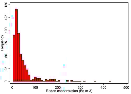 Radon concentration measurements in all rooms ranged from 4 Bq/m3 to 424 Bq/m3, with a median of 24 Bq/m3. The geometric mean of radon concentrations was 29 Bq/m3 with a geometric standard deviation of 2. The mean value of radon concentration was 45 Bq/m3. The frequency distribution of all radon concentrations is presented in Figure 1. Although radon activity concentrations appear to follow the lognormal distribution, the Shapiro–Wilk test fails the test of normality (p < 0.0001).