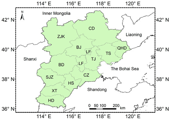 The Jing-Jin-Ji region is located on the eastern coast of China and comprises Beijing, Tianjin, and Hebei (Figure 1). According to the Hebei Economic Yearbook (2022), Jing-Jin-Ji covers an area of about 217,000 km2, has a population of 110 million, and in 2022, it had a GDP of 9636 billion. It has a humid continental climate characterized by hot, humid summers and cold, dry, winters []. Figure 1 shows the Jing-Jin-Ji region comprising Beijing (BJ), Tianjin (TJ), Shijiazhuang (SJZ), Tangshan (TS), Qinhuangdao (QHD), Handan (HD), Xingtai (XT), Baoding (BD), Zhangjiakou (ZJK), Chengde (CD), Cangzhou (CZ), Langfang (LF), and Hengshui (HS). As the largest urbanized megalopolis region in northern China, the Jing-Jin-Ji region is under considerable pressure to reduce carbon emissions [].