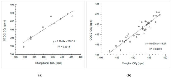 (a) Correlation of monthly mean CO2 from OCO-2 and Shangdianzi station from January 2015 to September 2015; (b) correlation of monthly mean CO2 from OCO-2 and Xianghe station form June 2018 to December 2021.