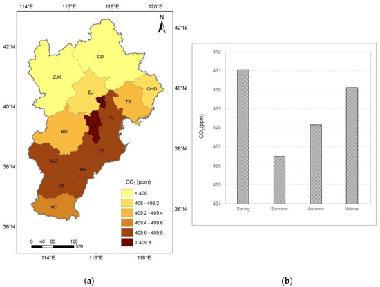 (a) Spatial distribution of CO2 concentration over Jing-Jin-Ji at the city level during 2015–2021; (b) multi-year seasonal average CO2 over Jing-Jin-Ji derived from OCO-2 for 2015–2021.