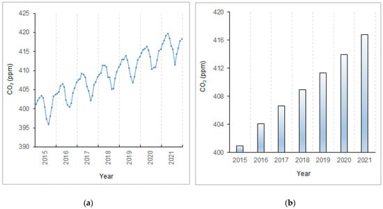 Atmospheric carbon dioxide (CO2) is the most significant anthropogenic greenhouse gas in the atmosphere because of its important role in global warming and the carbon cycle [,]. According to the World Meteorological Organization (WMO) report, the analysis of observations from the WMO Global Atmosphere Watch (GAW) in situ observational network shows that globally averaged surface mole fractions for CO2 reached new highs in 2021, with CO2 at 415.7 ± 0.2 ppm; the value constitutes 149% of pre-industrial (before 1750) levels []. This significant increase in CO2 concentration poses many direct and indirect threats to the climate system with adverse consequences, such as rising sea levels and more extreme weather conditions [].