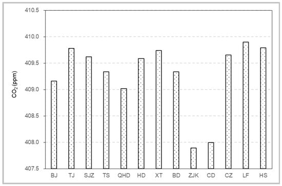 Figure 5 shows the annual mean CO2 concentration over Jing-Jin-Ji region at the city level based on OCO-2 data during the period 2015–2021; the yearly variations in the CO2 concentration over 13 regions are prominent; LF and HS have higher CO2 concentration, and ZJK and CD have lower CO2 concentration. The regions with a CO2 concentration higher than 409.5 ppm are TJ, SJZ, HD, XT, CZ, LF, and HS, and the regions with the CO2 concentration lower than 408 ppm are ZJK and CD.
