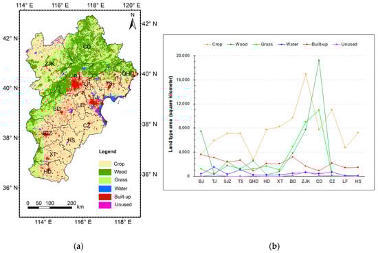 (a) Land cover type map of Jing-Jin-Ji in 2020; (b) area of each land type at the city level in 2020.
