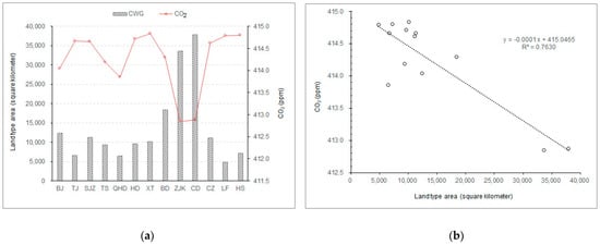 A comparison between the CO2 and CWG areas over Jing-Jin-Ji in 2020 is presented in Figure 8. Changes in CO2 are negatively correlated with the CWG areas (Figure 8a); the regions with higher CWG areas have lower CO2 concentration (like ZJK and CD). The CO2 concentration shows a high negative correlation (R2 = 0.76) to the CWG areas over Jing-Jin-Ji in 2020 (Figure 8b). Therefore, there is a relationship between land-type structure and CO2 concentration.