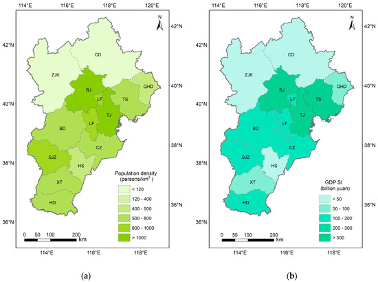 (a) Spatial distribution of population density over Jing-Jin-Ji at the city level in 2020; (b) spatial distribution of GDP SI over Jing-Jin-Ji at the city level in 2020.