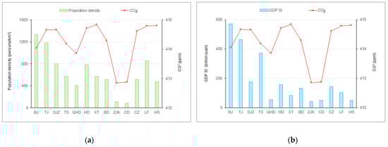 Population density and gross domestic product (GDP) distribution are the key factors affecting CO2 concentration. This paper quantitatively analyzes the relationship between population density, GDP density, and CO2 concentration over Jing-Jin-Ji. Figure 9a presents the spatial distribution of population density over Jing-Jin-Ji at the city level in 2020; regions with a population density greater than 1000 persons/km2 include BJ and TJ, and regions with a population density of less than 120 persons/km2 include ZJK and CD.