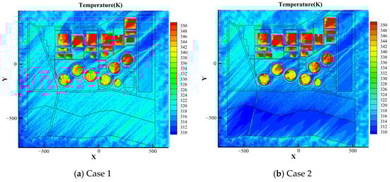 Figure 12 illustrates the average temperature distribution across different regions under cases 1 to 4. From Figure 11, it can be observed that in case 1, the temperature in areas around the buildings remains consistently high, approximately 319 K. However, in case 2, the presence of the water body results in a significant cooling effect, particularly in regions downstream of the water body. The cooling effect intensifies with proximity to the water body and leads to a temperature reduction of approximately 2 °C to 6 °C in the downstream regions. Similarly, case 3 demonstrates the cooling effect of greenery. As seen in Figure 13, the vegetation areas cause a significant temperature drop in the adjacent regions, with the cooling effect diminishing with increasing distance from the greenery. However, some areas within the greenery exhibit higher temperatures, which may be attributed to low wind speeds that reduce the dissipation of heat and lead to localized warming. Case 4, which combines the effects of both water bodies and greenery, shows a cooling effect in the downstream regions. However, this combined cooling effect is not linear, and the synergy between greenery and water bodies does not produce significantly greater cooling than when each element is considered separately. This is likely due to the distinct mechanisms of cooling: the water body dissipates solar heat through evaporation and heat transfer to deeper layers, while the greenery interacts with the wind flow, redistributing heat and altering temperature patterns.