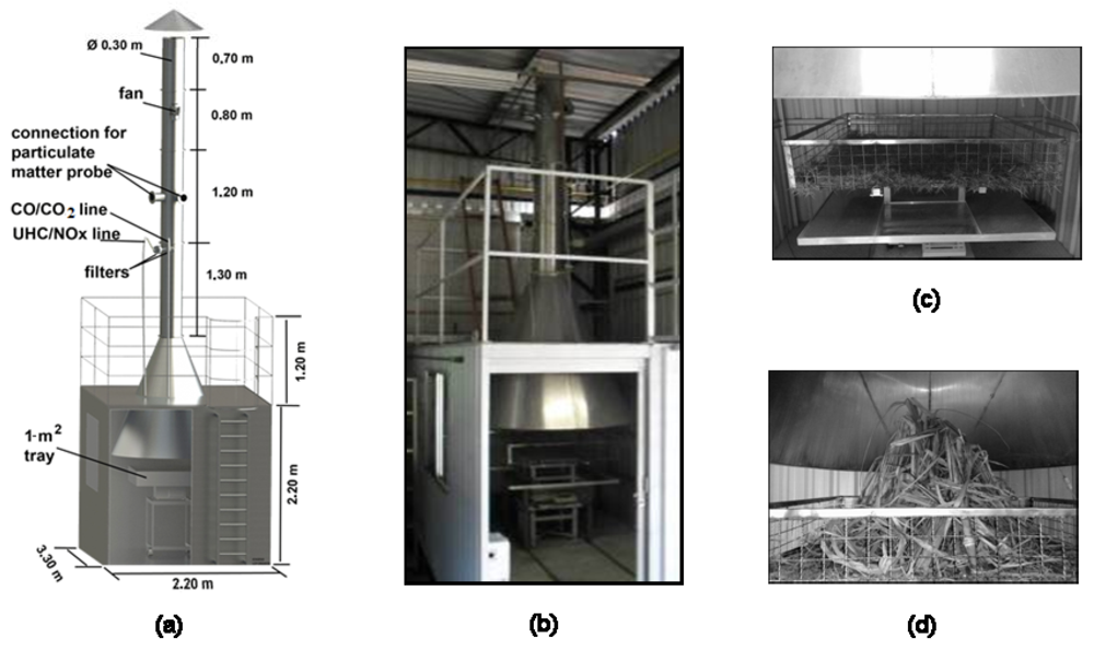 In this context, the objective of this work is to determine emission factors for the trace gases CO2, CO, NOX, and UHC (unburned hydrocarbons) emitted during sugarcane straw burning, based on continuous measurements taken under controlled laboratory conditions, with the aim of contributing to the generation of inventories that include emissions of this nature. Similar measurements were also made in this study in order to estimate the emission factor for particulate matter with an aerodynamic diameter equal to or less than 2.5 μm (PM2.5)—fine particulates—emitted by sugarcane straw burning, by virtue of its important role as a risk factor for respiratory diseases [36]. This study also aims to improve knowledge about the combustion phases (flaming and smoldering) and their respective durations and emissions of chemical species, since this understanding is important for the improvement of emissions estimations made by means of numerical modeling and, consequently, the prediction of their environmental impacts [4,25].