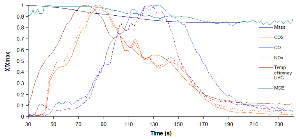 Concentrations of trace gases and the other process variables were transmitted to a data acquisition system that continuously recorded the measurements during the test with an interval of approximately 1 s. The data saved for each experiment were: time [s], mass [g], CO2, CO, UHC and NOX concentrations, gas temperature in the chimney [°C], and the volume flow rate of gas in the chimney [m3 h−1]. Each experiment lasted 2 to 7 min from ignition until the end of smoldering phase, depending on the moisture content of the sample. The ignition was carried out with an LPG (liquefied petroleum gas) blowpipe. The ignition period was not taken into account to avoid blowpipe influence on the CO2 concentration.