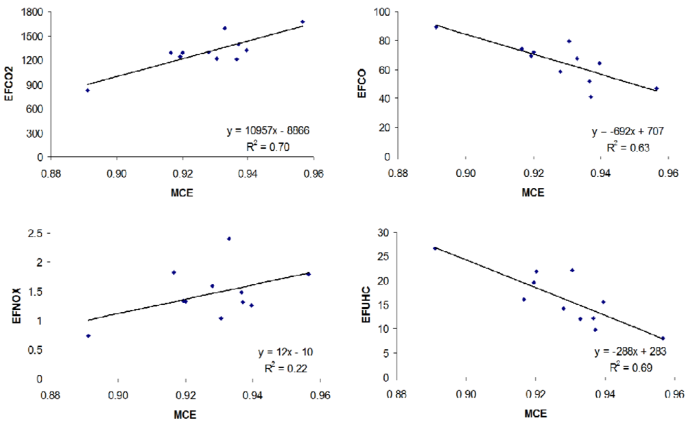 Graphical representation of the emission factors (EF) for CO2, CO, NOX, and UHC versus the modified combustion efficiency (MCE).