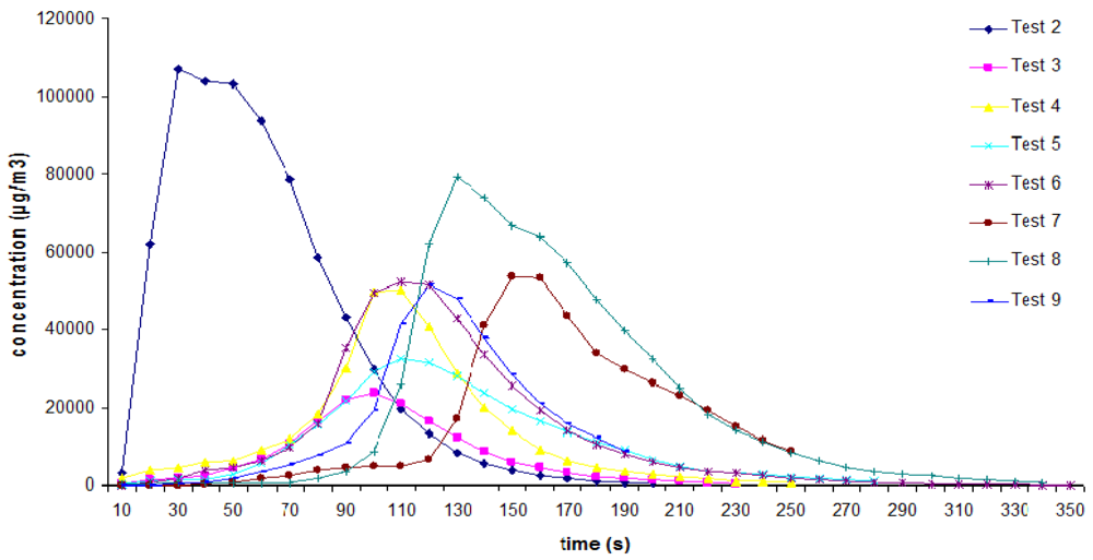 Figure 5 shows the average PM2.5 concentration, whose highest level was approximately 110,000 μg/m3 during one of the experiments conducted in 2010. There was a significant increase in the concentration of fine particulates, since background values of around 0.1 μg/m3 to 2.4 μg/m3 were recorded before the initiation of the burning. The delay in the increase of emitted particulate matter in Tests 7 and 8 is due to the higher humidity content of their respective samples, which caused a delay in the initiation of the flaming phase in both experiments. This is unlike what occurred with the dry fuels, which burn more easily, as observed in the shape of the curve for Test 2, whose sample contained the lowest humidity content of all the samples (about 17% while the other burn samples’ fuel moistures were higher than 26%, most of them ranged between 30% and 40%) according to Table 2. Much higher concentrations of particles occurred during Test 2 because more fuel was being consumed in this particular burn during the early stages of the fire compared to all the other studies. The results of this experiment were also used to determine the emission factor for PM2.5 and that was the reason for the rather large standard deviation observed in Table 1.