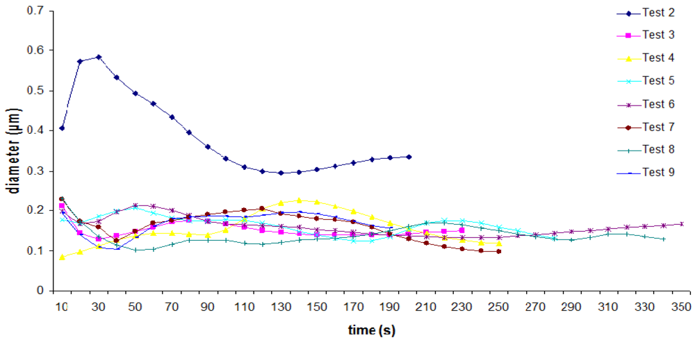 Figure 6, on the other hand, shows the variation of the average diameter (μm) of the PM2.5 emitted during the sugarcane straw burning in the experiments conducted in 2010. On average, diameters of 0.08 to 0.23 μm were recorded. A significant difference is noted in the values of the mean particulate matter diameter recorded during Test 2 compared to the other tests. The larger particle size, whose peak occurred in the flaming phase, must be related to the fact that the humidity content of the sample used in this test was much lower than the humidity content of the other samples.