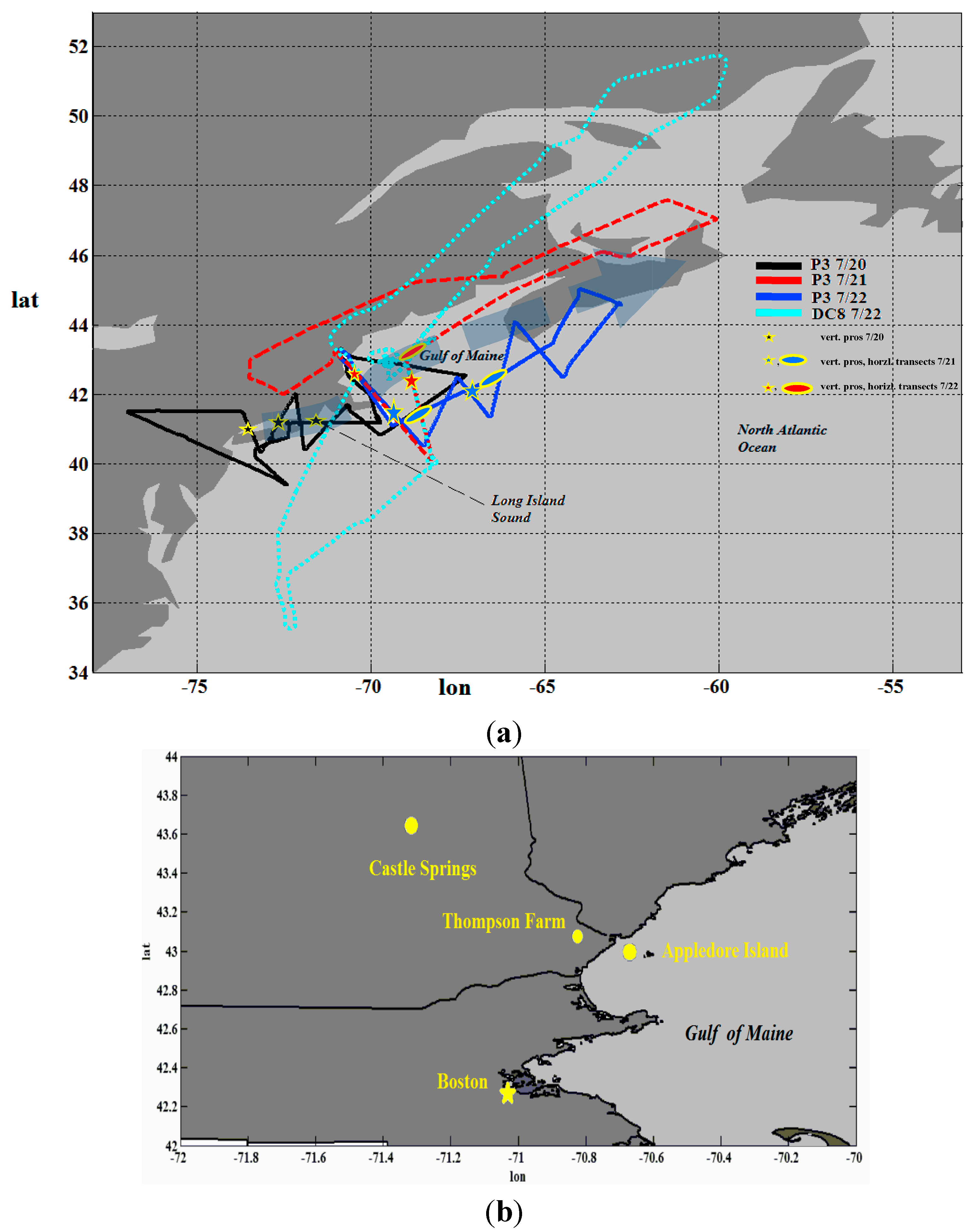 These works provide motivation for the present study which builds upon previous efforts to better understand LLO and the dynamics of the coastal circulation as transport pathways of the North American continental outflow. The National Oceanic & Atmospheric Administration (NOAA) WP-3D flights in particular during the ICARTT campaign yielded invaluable observations of the composition and structure associated with low-level pollution transport from the Eastern U.S. during the summer of 2004. Three sequential flights between 20 July and 22 July provided the unique opportunity to observe flow of a freshly emitted plume along the northeast coast, into the GOM and its eventual outflow into the Western North Atlantic. Specific objectives of our study were to employ these observations in a quasi-Lagrangian manner to investigate the composition and dynamics of such regional plumes, influences of the local marine atmospheric boundary layer (MABL) on plume transport, and the contribution of such plumes to North American continental outflow.