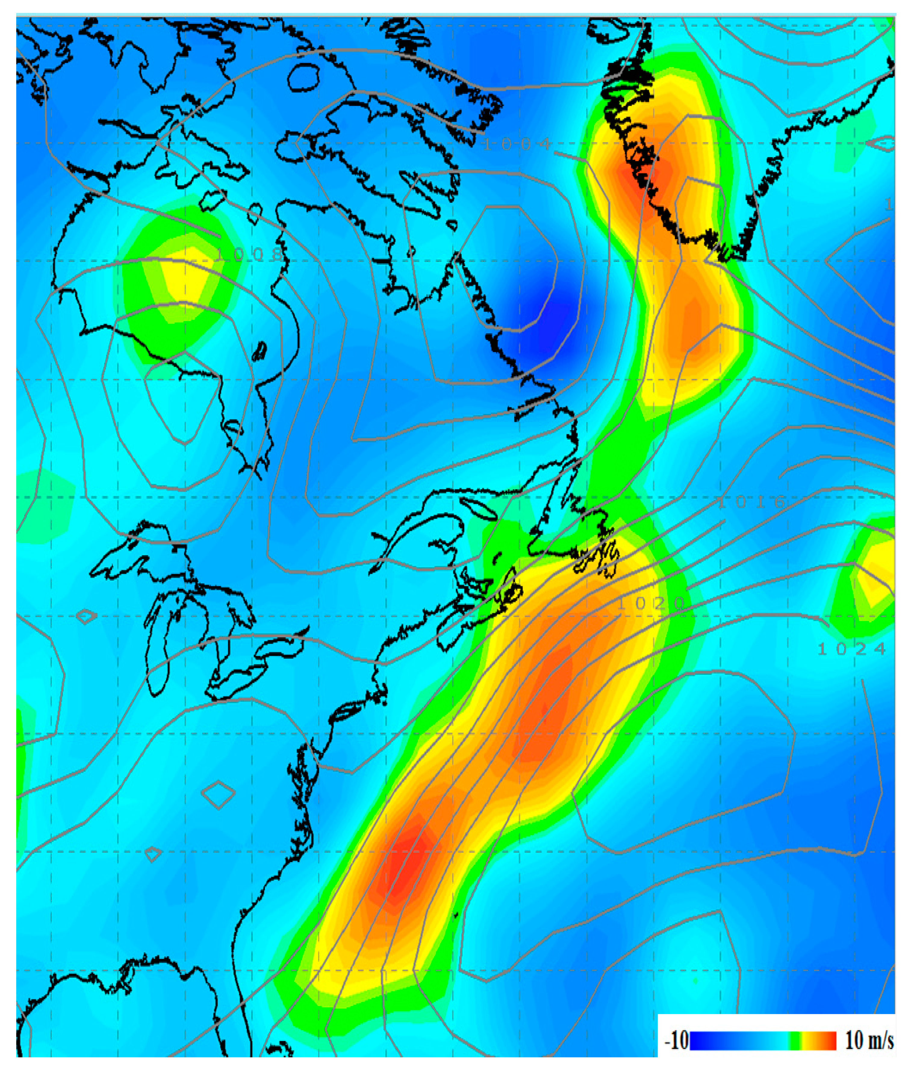 As discussed in related studies [5,20,21] this flow was established primarily under the influences of the Bermuda High to the southeast of the source region and the Canadian low-pressure system initially centered to the northwest along the northern edge of Hudson Bay. Upper level patterns similarly depicted the influence of these large-scale features within the region with the jet stream maintained northwest of the Great Lakes supplying a relative northeasterly flow aloft. The ventilation of the plume coincided the development of a mild mesoscale low-pressure trough between these larger synoptic features over the Mid-Atlantic states developing near the surface (Figure 2). Over the 21st and 22nd, the Canadian Low translated progressively eastward and strong southwesterly flow was maintained off the North American coast (not shown).
