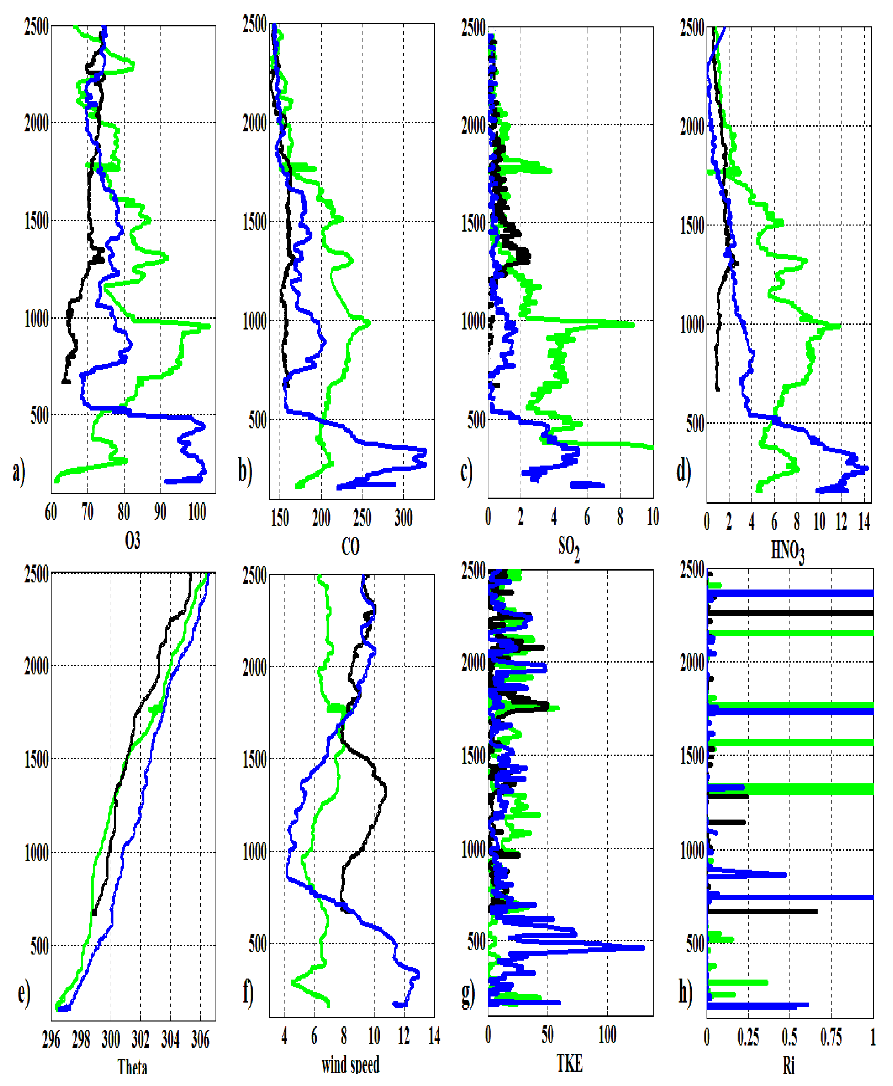 Vertical profiles of primary trace gas species and physical parameters observed near the NYC source region on 7/20. Shown are mixing ratios for (a) O3; (b) CO; (c) SO2; (d) HNO3 (all in ppbv) along with (e) theta (K) (f) horizontal wind speed (m/s); (g) turbulent kinetic energy (J/kg); and (h) Richardson number. Black lines correspond to the observations directly over the NYC region at 18:30 UTC; green lines designate the evolution observed 130 km downwind of NYC at 19:20 UTC; and Blue lines mark observations 250 km downwind at 20:00 UTC.