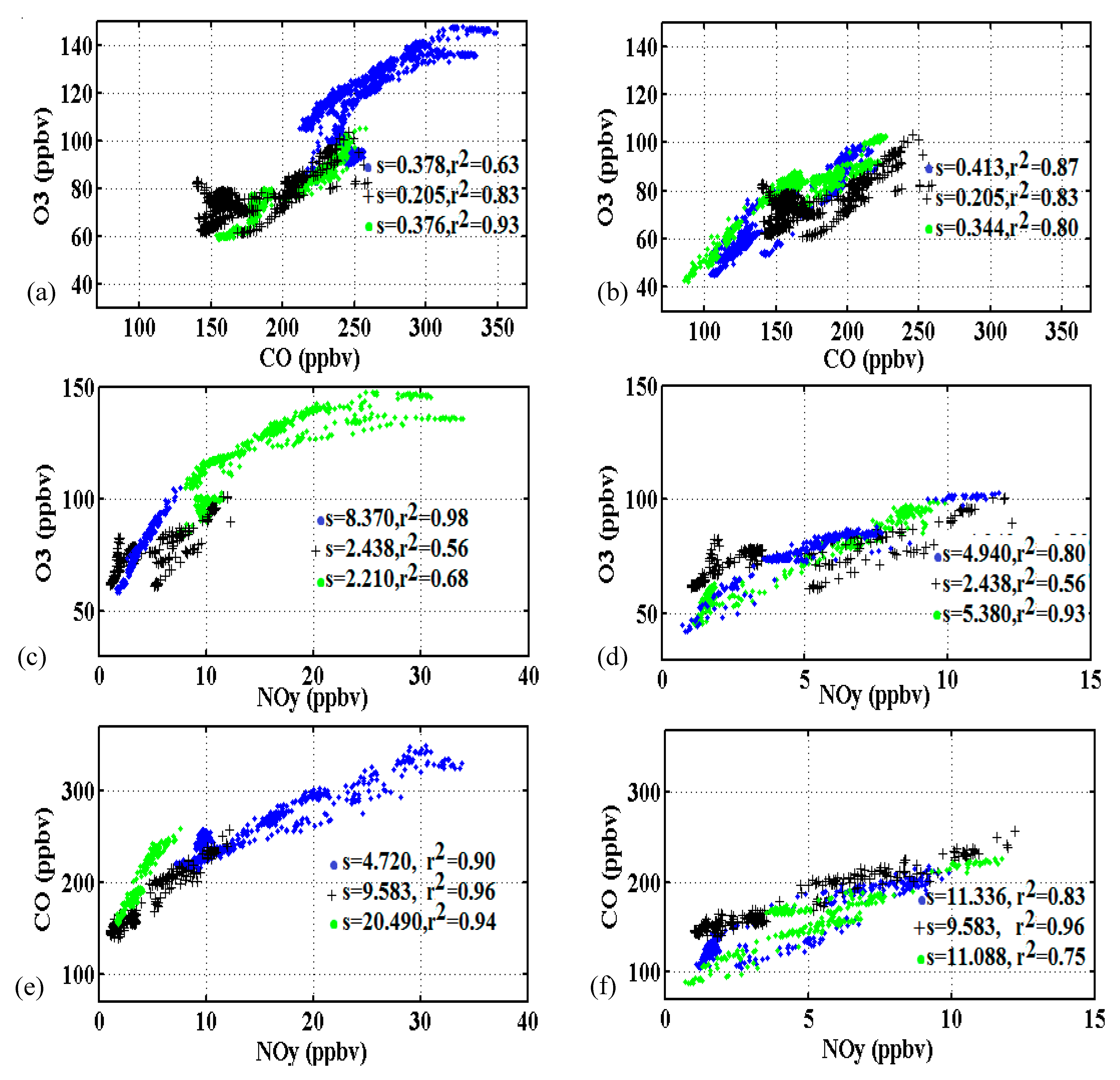 The O3/NOy relationships derived from the same source region profiles similarly exhibited correlation between the species. However, some variability resulted from probable depositional losses of NOy and possible mixing of aged and fresher emissions within the plume given its two day history. In the 18:30 UTC intercepts, it was seen that a linear relationship (r2 = 0.56) was observed between O3 and NOy, (Figure 5c, black markers) with further analysis suggesting that a mixture of airmasses may have been intercepted during initial plume encounters. At higher NOy levels (>8 ppbv), the correlation was higher (0.68), and reflective of recent emissions, while at lower mixing ratios of NOy (<5 ppbv), the correlation was less (0.49), more suggestive of photochemically aged airmasses and loss of NOy through deposition (not shown). The CO/NOy relationship exhibited clear linearity, with a fitted slope of 9.583 (r2 = 0.96) as seen in Figure 5e. Such close correspondence between CO and NOy is indicative of a common combustion source such as automobiles [10].