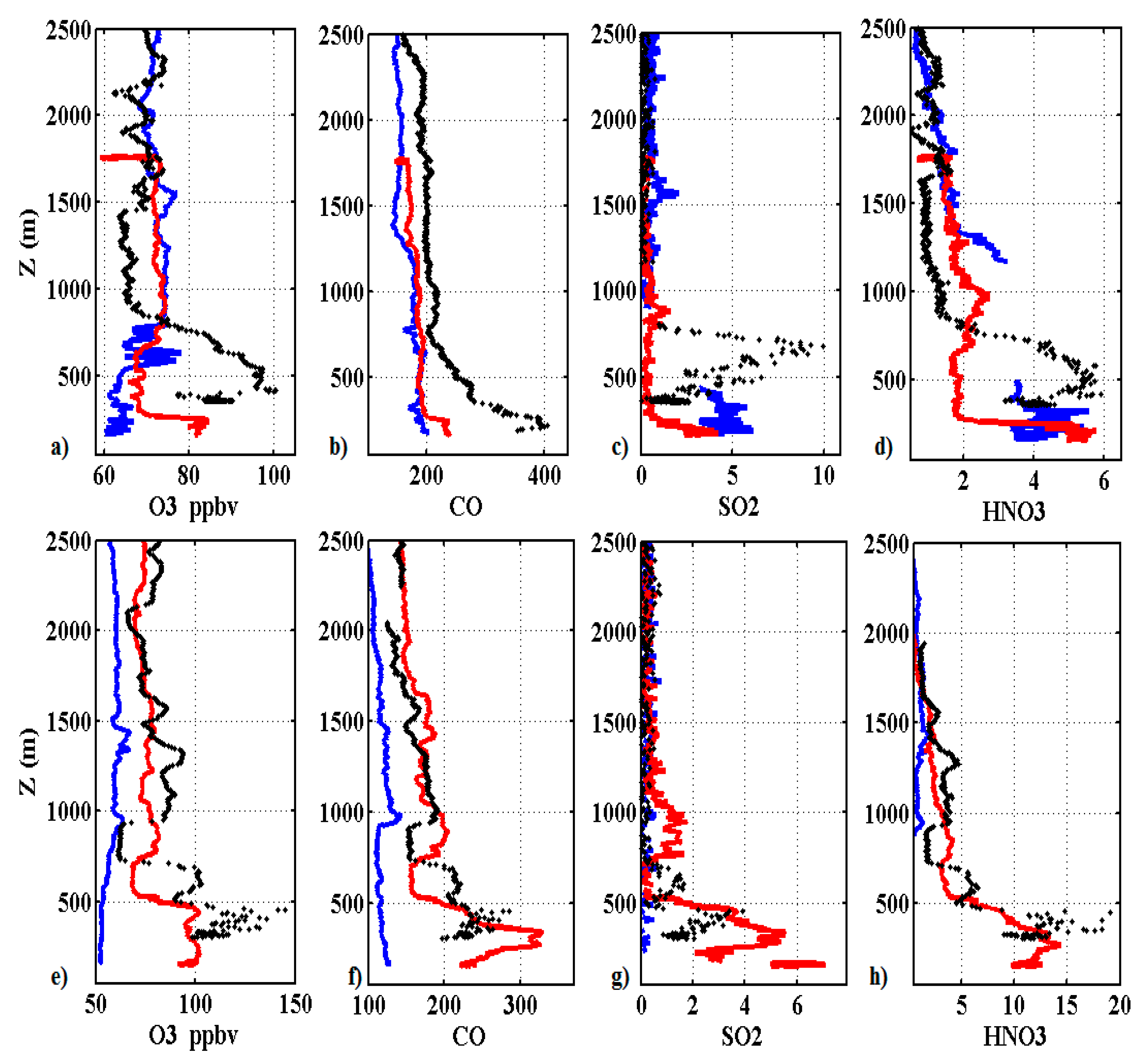 In the case of the NYC plume, IBL characteristics of the transport layer developed as the plume airmass residing in a residual layer of the continental boundary layer was advected over the coastal waters of Long Island Sound, overrunning the MABL in the process. Distinct stages of plume layer’s evolution towards the IBL-like structure were clearly discernible during the aircraft intercepts, as shown in Figure 3. From these, it was seen that, the plume was initially encountered in a residual layer of the continental atmospheric boundary layer near the NYC source region (Figure 3a–d, black lines). Subsequent transformations were evident in the downwind encounters (moving from northeastward from NYC to the GOM). As seen in the mixing ratio profiles of O3, CO, SO2, and HNO3 presented in Figure 3a–d, adjustment of the plume airmass to its new surroundings was manifested in its subsidence towards the surface.