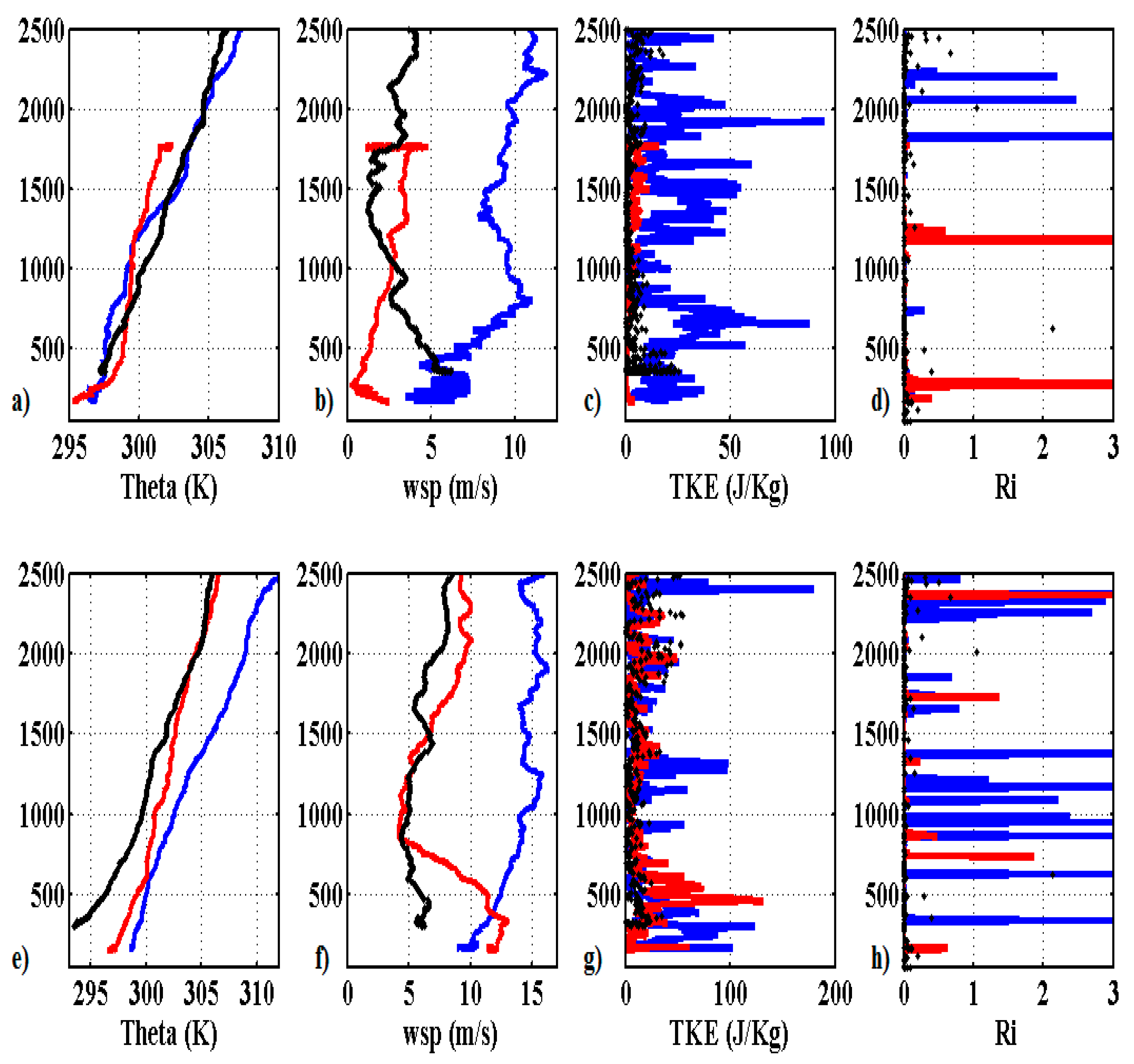 Aircraft profiles over the coastal GOM of (a) potential temperature (K); (b) horizontal wind speed (m/s); (c) turbulent kinetic energy (TKE, J/kg); and (d) Richardson number values; Corresponding observations of the same parameters over the Western Atlantic/Eastern GOM are shown in (e–h). Blue lines represent observations on 7/20, red 7/21 and black 7/22.