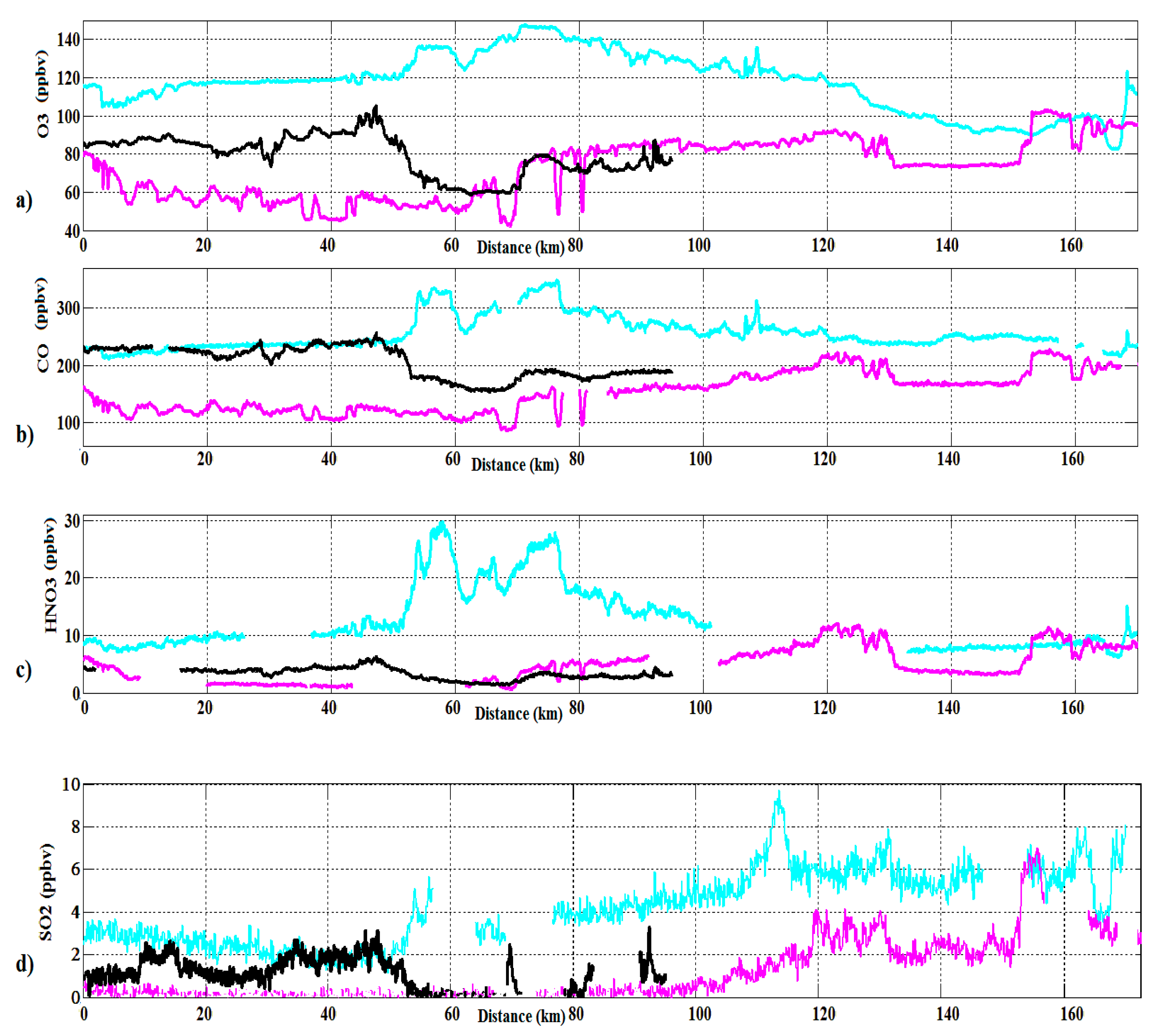 In contrast, trace gas observations made during the same transects exhibited high degrees of spatial variability and with two distinct regimes being apparent over the coastal and open ocean waters. As shown in Figure 9a,b, O3 and CO of the 7/20 plume varied significantly, even over short spatial intervals. Within the same southern GOM transect discussed earlier, CO mixing ratios oscillated 160 ppbv about a mean value of 205 ppbv, and O3 ranged ±70 ppbv about a mean value of 117 ppbv (cyan lines). Similar behavior was observed in HNO3, SO2 (Figure 9c,d, cyan lines). In comparison, wide fluctuations in trace gas mixing ratios over the western GOM-open Atlantic suggested lower values but characterized similar behavior (magenta lines). Mixing ratios of CO were generally below 200 ppbv with O3 and HNO3 correspondingly less than 100 ppbv and 12 ppbv, respectively.