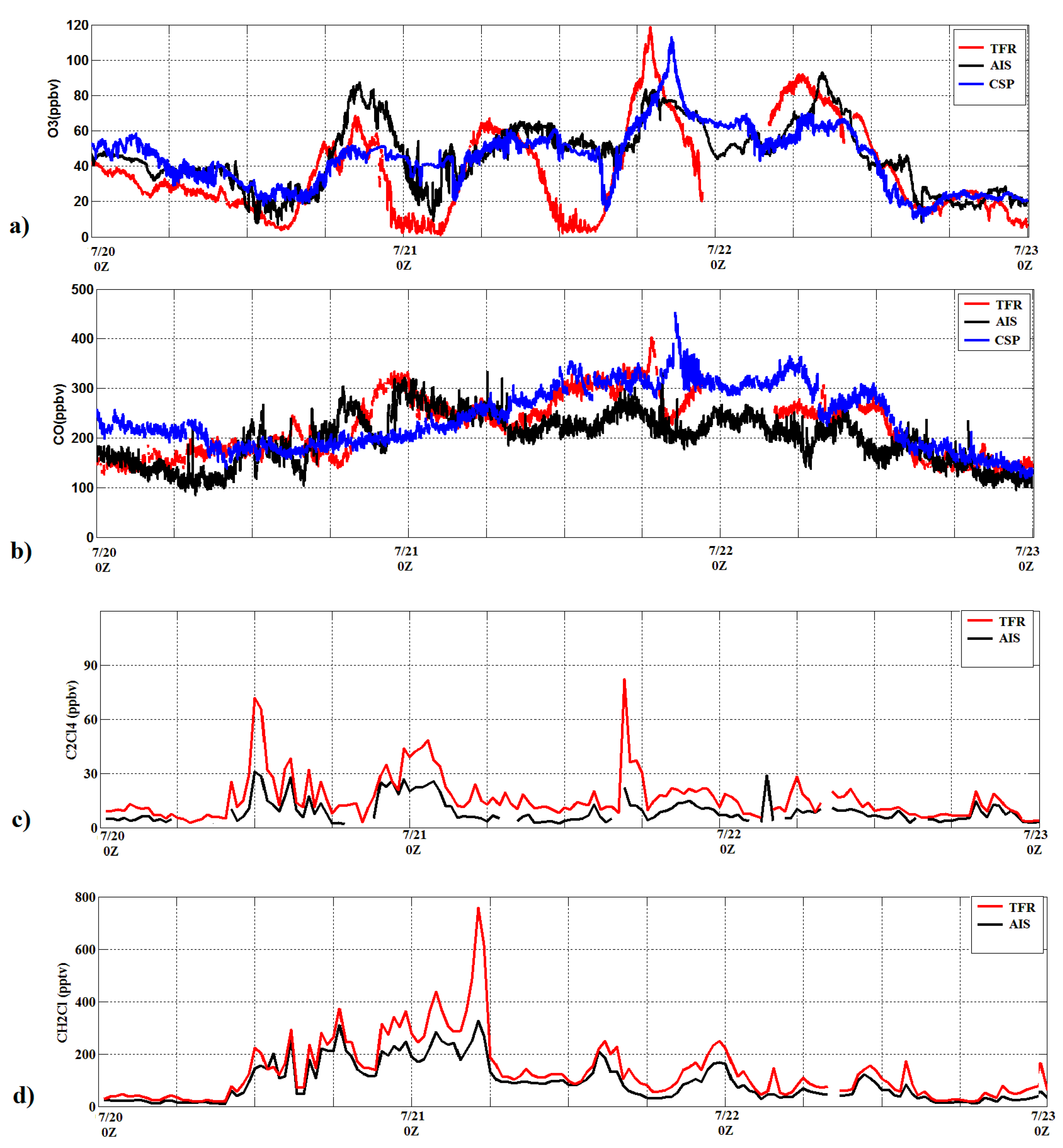 Surface observations from the AIRMAP stations during the transit of the NYC plume. Shown are measurements of (a) O3 and (b) CO at three AIRMAP stations: TFR (red), AIS (black), and CSP (blue). Canister observations of (c) C2Cl4 and (d) CH2Cl taken at TFR and AIS are also shown for the same time period.