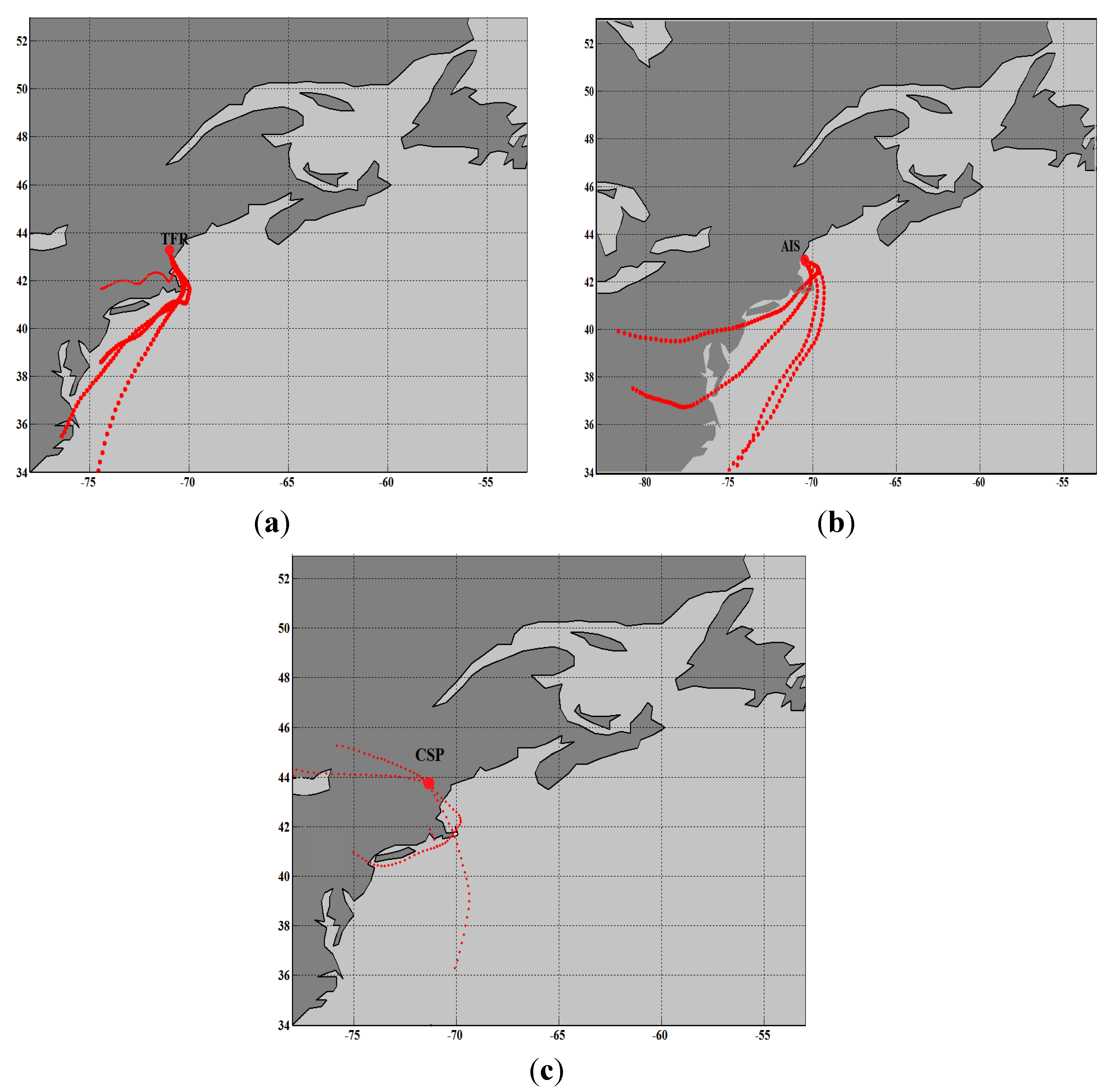 Lagrangian back trajectories from the NOAA HYSPLIT model for 36 h prior to the plume mixing inland on 7/21. Shown are trajectories for (a) TFR; (b) AIS; and (c) CSP AIRMAP stations used in the inland analysis.