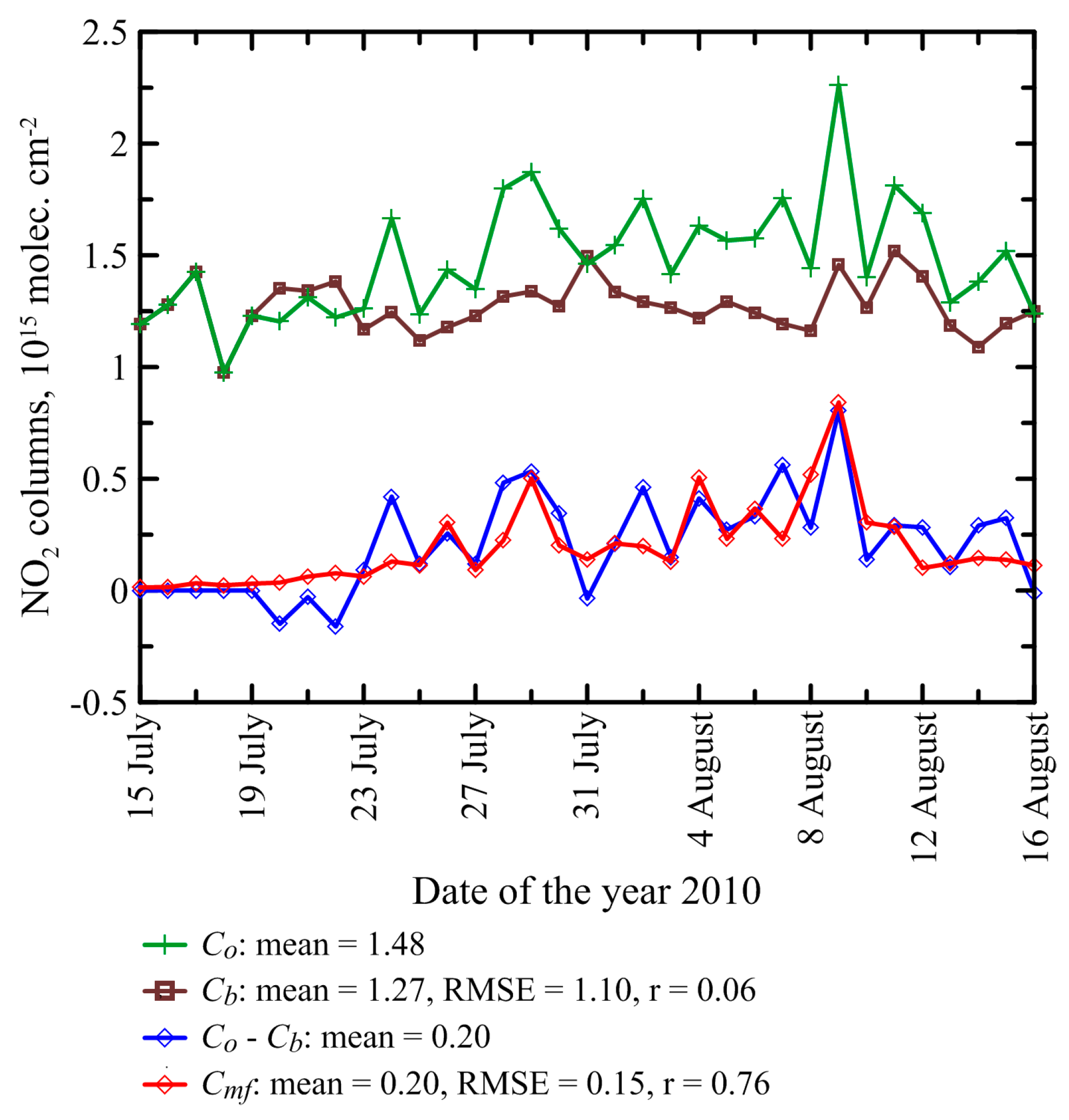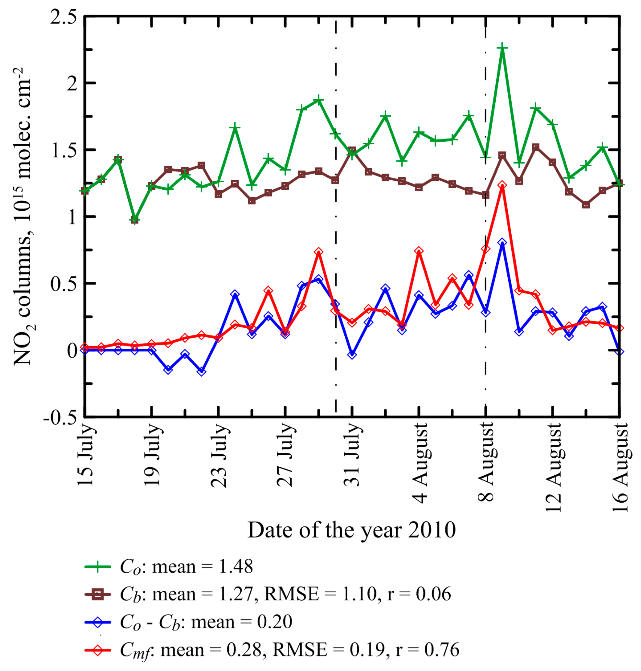 Time series of the daily NO2 column amounts averaged over the study region. Co: the tropospheric NO2 columns retrieved from OMI measurements; Cb: a background part of tropospheric NO2 columns; Cmf: the simulated tropospheric column amounts of NO2 from wildfires. The vertical dash-dot lines mark the data for 29 July and 8 August. The RMSE and the correlation coefficient indicated in the figure legend for Cb and Cmf were calculated relative to Co and Co − Cb, respectively.