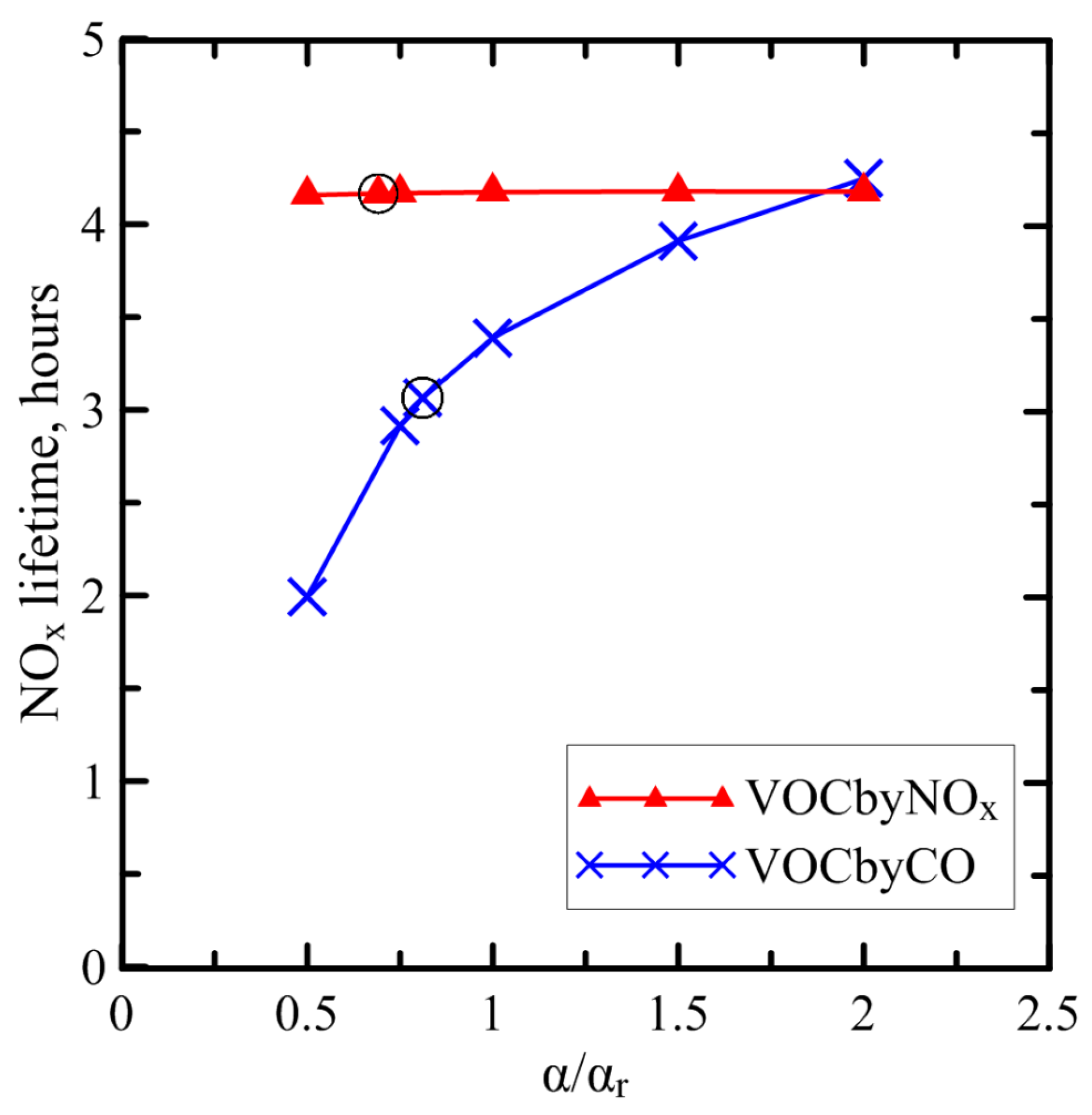 The effective NOx lifetime (τnox) estimated a function of the FRP-to-BBR conversion factor (α) normalized to its reference value (αr). Black circles depict the NOx lifetime values corresponding to the optimal estimates of α for the two estimation cases (“VOCbyNOx” and “VOCbyCO”) considered in this study.