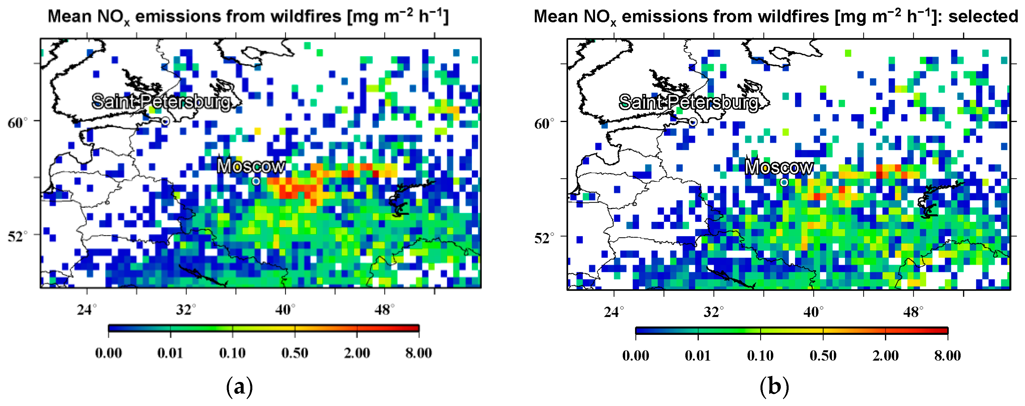 Figure 8 presents the spatial distributions of the BB NOx emission rates averaged over the study period. The two different distributions (shown in Figure 8a,b) correspond to the two respective time series presented in Figure 7. Expectedly, the distribution obtained only with the selected data typically features smaller BB NOx emission rates compared to the one obtained using all the available emission data. Nonetheless, it is important to note that both the coverage and spatial structure of the emission rates shown in the different distributions are rather similar. In particular, both distributions show that there were strong NOx emissions from fires in the regions south-east and east of Moscow as well as around Russia’s border with Kazakhstan (near the bottom right-hand corner of the model domain). Furthermore, only 9% of the fire spots (grid cells with non-zero fire emissions) shown in Figure 8a are missing in Figure 8b. Therefore, a comparison of the spatial distributions shown in Figure 8a,b provide evidence that our optimal conversion factor estimate that was used to scale BB NOx emissions rates across the study region is, to a considerable extent, representative of the whole region and period considered. Note that, according to a special test involving splitting the study period into two approximately equal parts, the difference between the optimal values of the conversion factor for those periods was less than the statistical uncertainty of our estimate for the whole period. Although the result of this test provides further evidence in favor of applicability of our optimal conversion factor estimates across the study region and period, the question regarding the representativeness of the conversion factor estimates derived from observations of the limited number of fire scenes still remains and requires further investigations that go beyond of the scope of this study.
