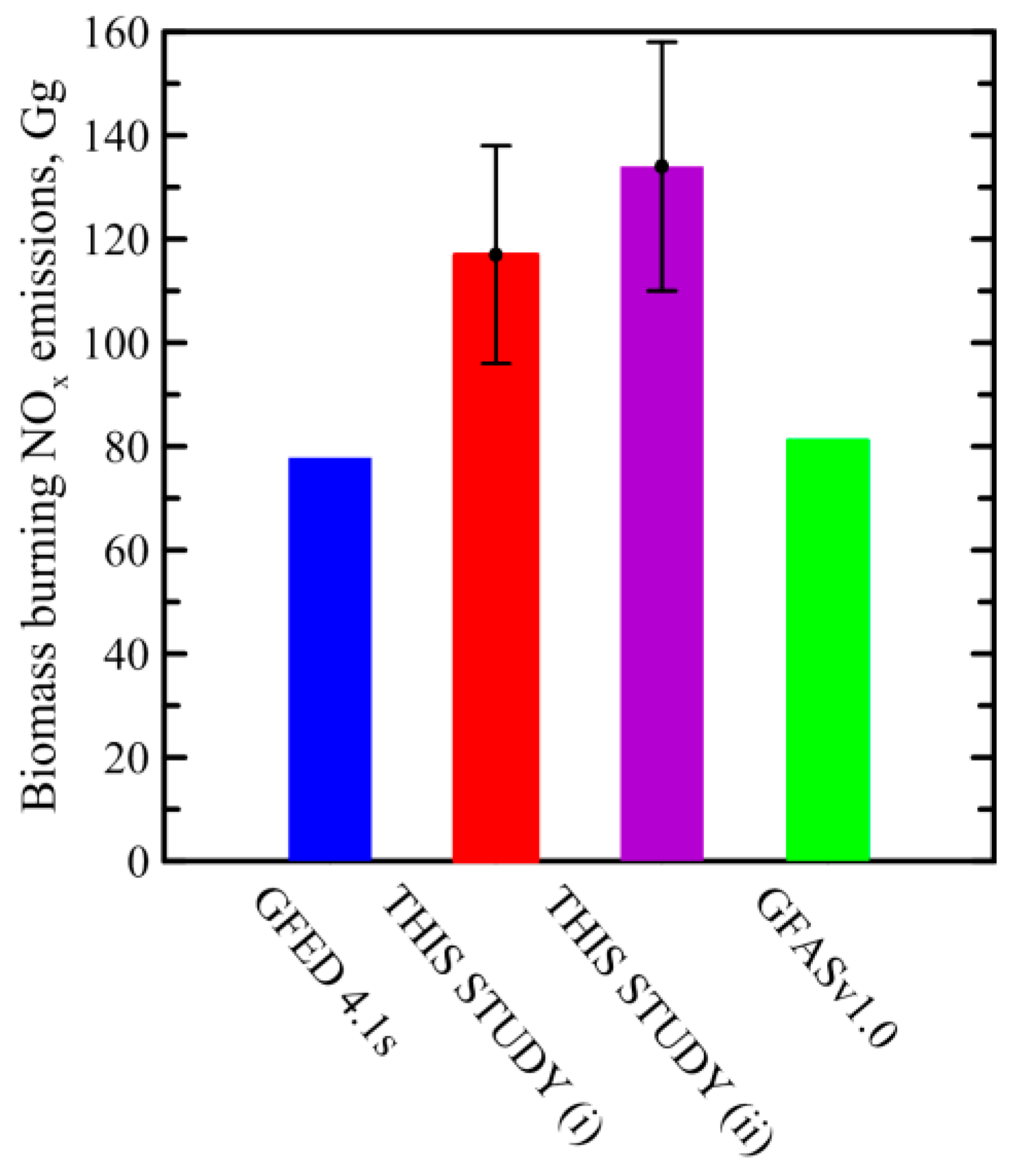 Optimal estimates of the total NOx emissions in the study region and period in comparison with corresponding estimates based on the data of the GFED4.1s and GFASv1.0 emission inventories. The optimal estimates are shown separately for the two estimation cases, “VOCbyNOx” (i) and “VOCbyCO” (ii). The confidence intervals represent statistical uncertainty evaluated in terms of the 95th percentile.
