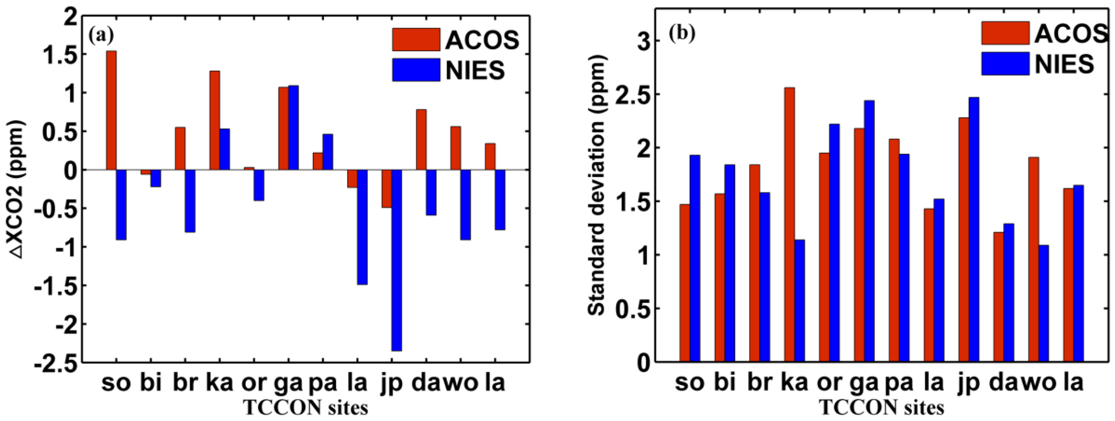 The column averaged dry air mole fractions of atmospheric carbon dioxide (XCO2) bias (a) and standard deviation (b) of the Atmospheric CO2 Observations from Space (ACOS) and the National Institute for Environmental Studies (NIES) versus Total Carbon Column Observing Network (TCCON) observations listed in Table 1. The TCCON sites are arranged from high to low latitude.