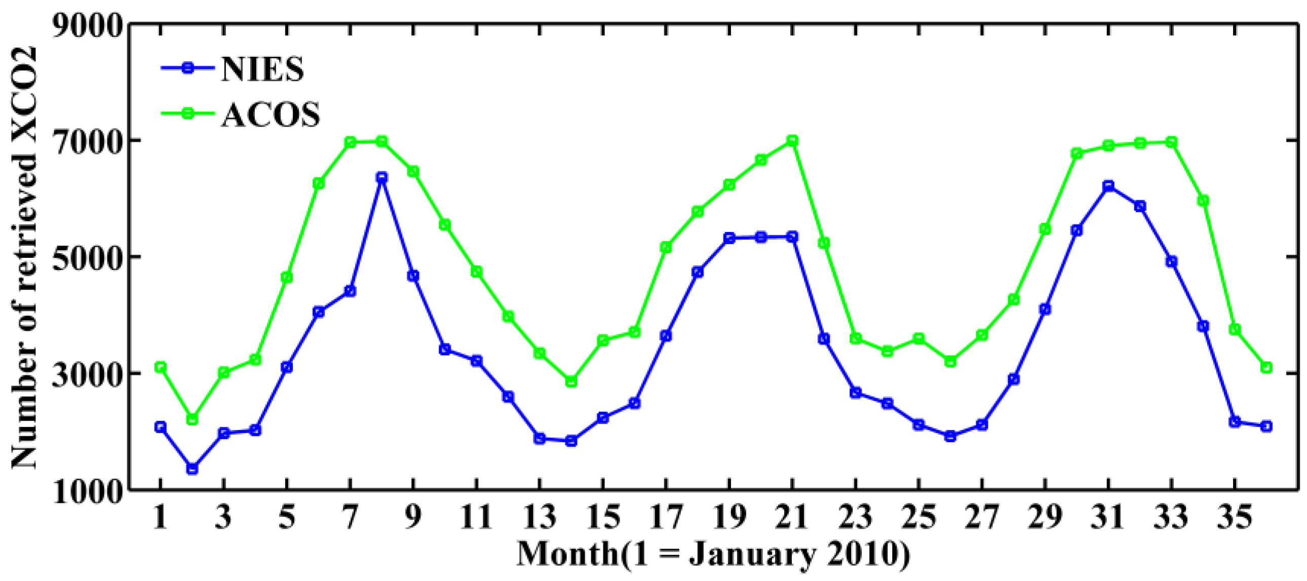 As seen in Table 1, the number of ACOS retrievals matched with TCCON data is significantly more than NIES. In order to compare the yields of ACOS and NIES XCO2 retrievals, Figure 3 presents the monthly numbers of global ACOS and NIES dataset over High gain land surface. Both ACOS and NIES XCO2 datasets plotted in Figure 3 passed the post-screening filters. According to Figure 3, the yield of NIES XCO2 is averagely 71% of that of ACOS retrievals, with the monthly number rates of NIES to ACOS ranging from 56% to 91%. Multiple factors contribute to the different yields. The NIES retrievals are limited to satellite scenes with solar zenith angles less than 70 degrees, which is less than that of ACOS (85 degrees) [11,16] and eliminates more NIES soundings in the pre-processing. The strategy and methods for cloud screening in ACOS retrievals differ from NIES and could also lead to different yields [11,13,16]. The more rigorous aerosol optical depth (AOD) filter in the NIES post-screening also rejects more retrievals than ACOS [13,16,24]. The number of XCO2 retrievals showing a large seasonal variation also can be seen in Figure 3. This is because the GOSAT soundings with large solar zenith angles in northern high latitudinal regions in winter and early spring are filtered out. The snow-/ice-covered measurements are also removed by the blended albedo filter [13]. Furthermore, the content of desert dust and Asia aerosol is larger in Northern Hemisphere winter and spring and the GOSAT retrievals with high AOD are filtered out [13]. This seasonal characteristic of the desert dust and Asia aerosol could also contribute to the seasonal variations.