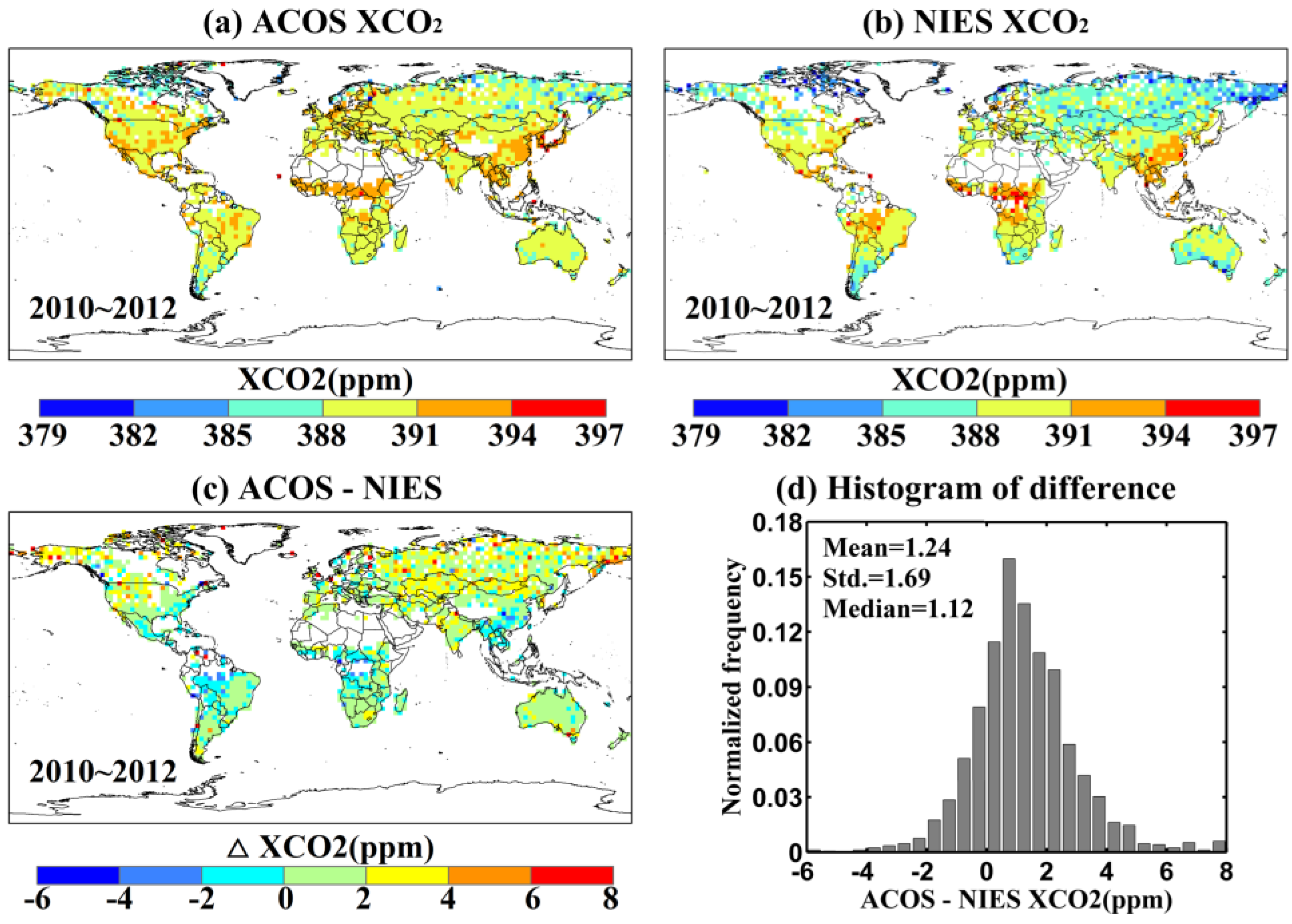 Global distribution of three-year averages of ACOS (a) and NIES (b) XCO2 and their difference (c) gridded in 2.5° × 2.5° bins from 2010 to 2012; the histogram of difference shown in (c) is presented in (d).