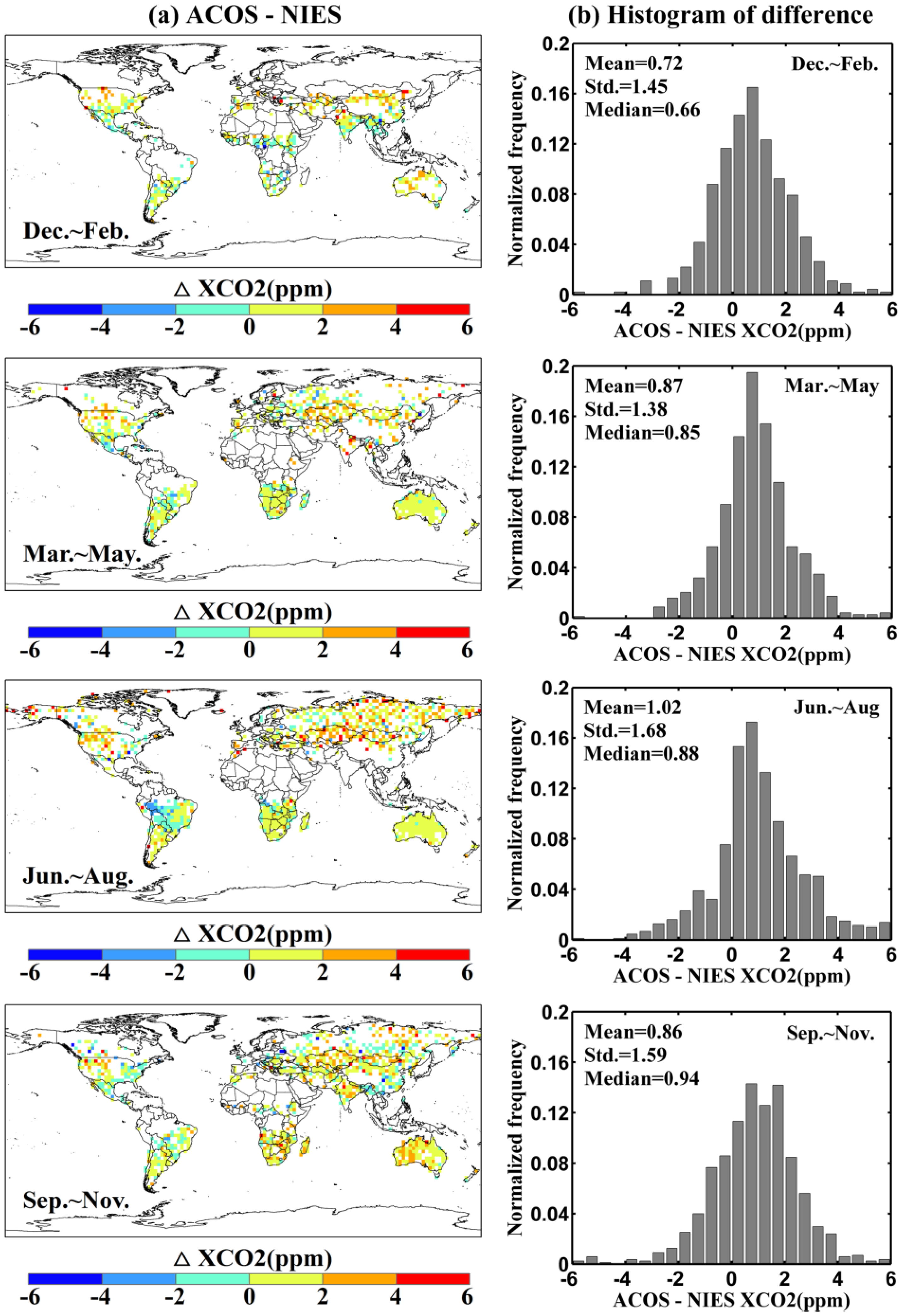Seasonal difference (a) gridded in 2.5° × 2.5° bins between ACOS and NIES XCO2 means and the histogram of their difference (b) in each season from December 2011 to November 2012.