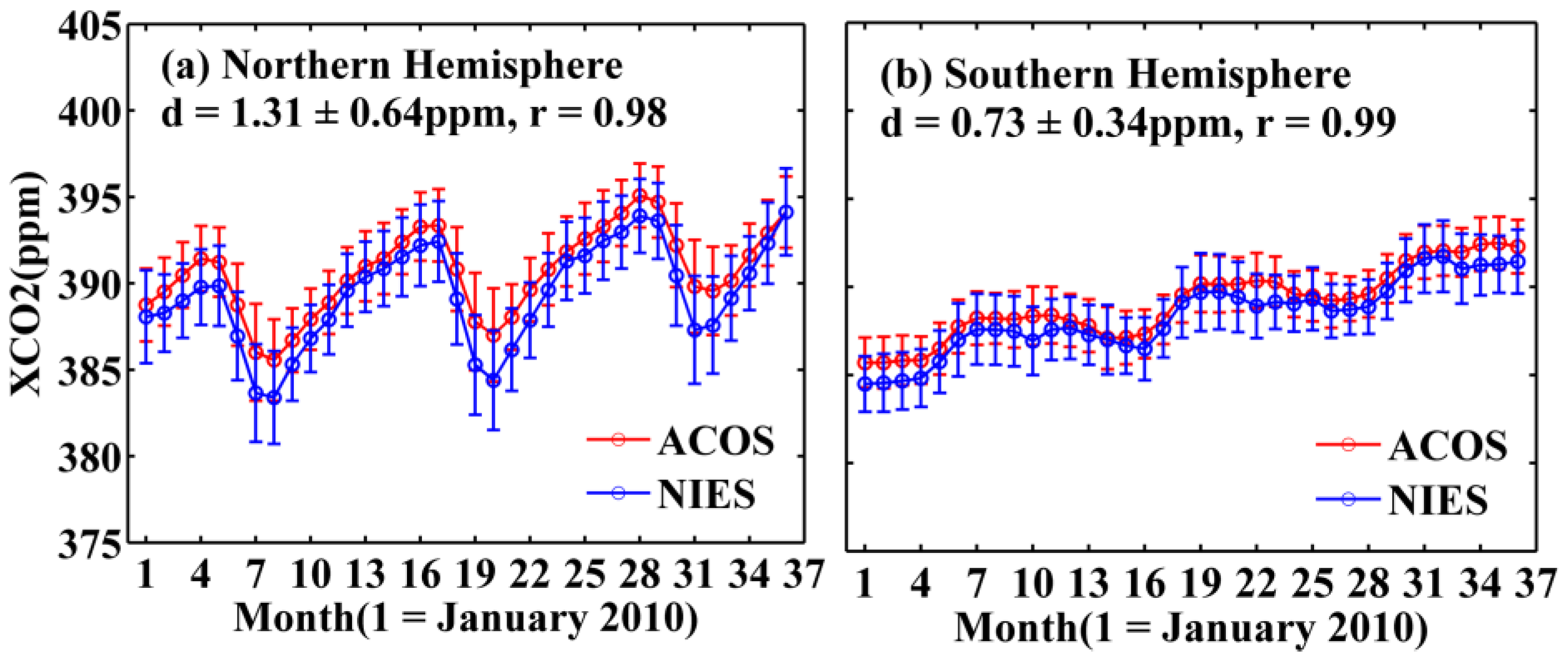 Time series of NIES and ACOS XCO2 monthly mean in the Northern (a) and Southern (b) Hemispheres for three years. The mean difference d of ACOS to NIES and its corresponding standard deviation, and the correlation coefficient r between NIES and ACOS are evaluated based on the XCO2 monthly means.