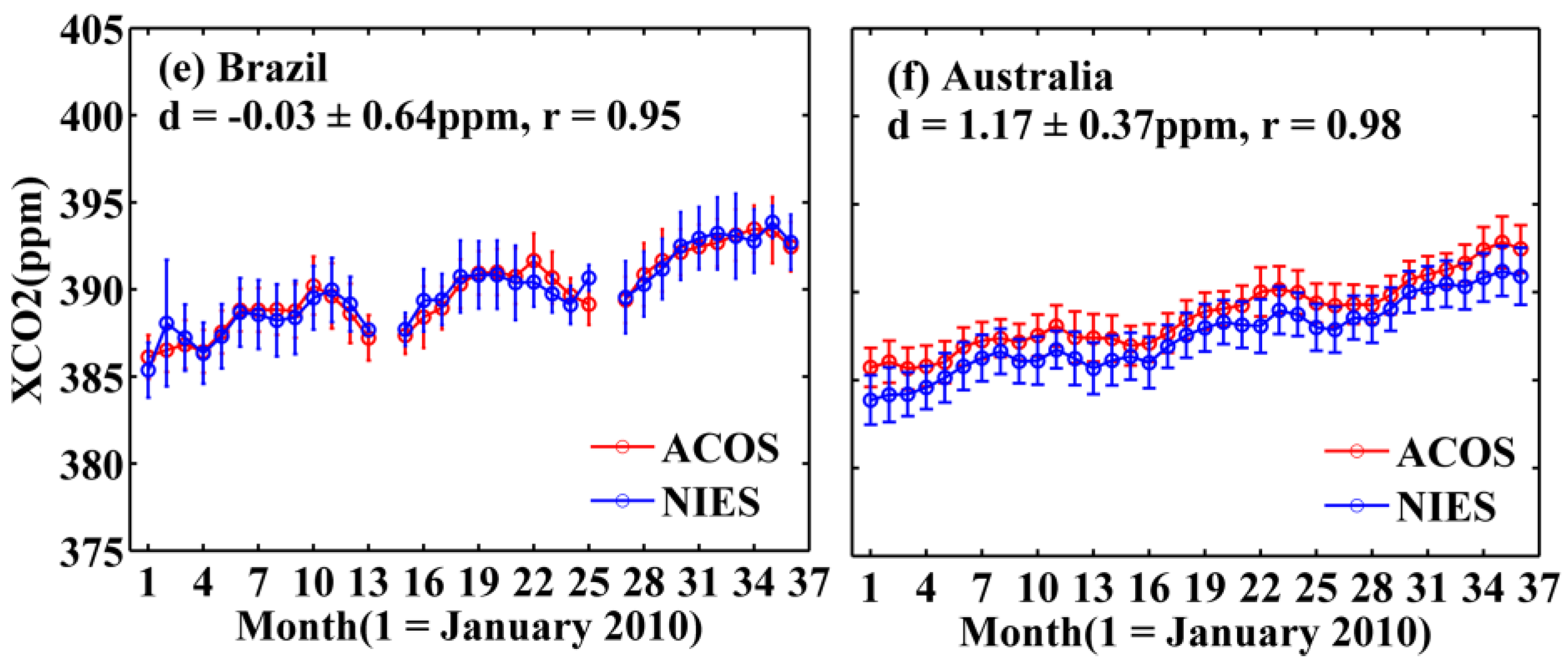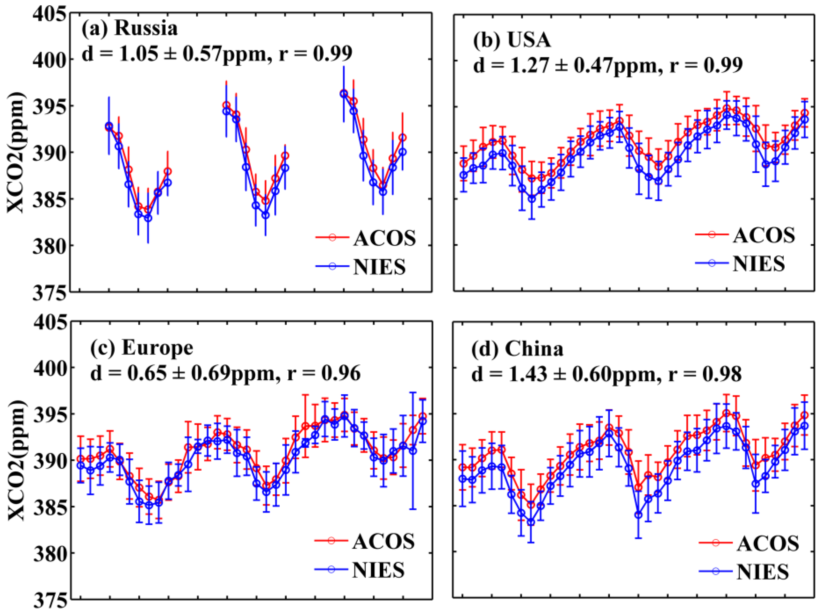 To further examine the difference between ACOS and NIES XCO2 for different regions, Figure 7 presents the XCO2 monthly means over six typical countries or regions. As can be seen from Figure 7, the differences of XCO2 monthly mean vary depending on the locations and months. Among the four northern countries or regions, the mean difference of XCO2 monthly means is smallest over Europe (0.65 ± 0.69 ppm) and the largest over China (1.43 ± 0.60 ppm). As there are large amounts of human activity and complex CO2 sources/sinks in China region, it may indicate large errors in the retrieval results for China region. In addition, the interference of high content and complex type of aerosol particles over China may also contribute to the difference between ACOS and NIES XCO2 retrievals. The mean difference is slightly larger for the USA (1.27 ± 0.47 ppm) than Russia (1.05 ± 0.57 ppm). In the Southern Hemisphere, the XCO2 monthly mean difference over Australia (1.17 ± 0.37 ppm) is significantly greater than that of Brazil (−0.03 ± 0.64 ppm).