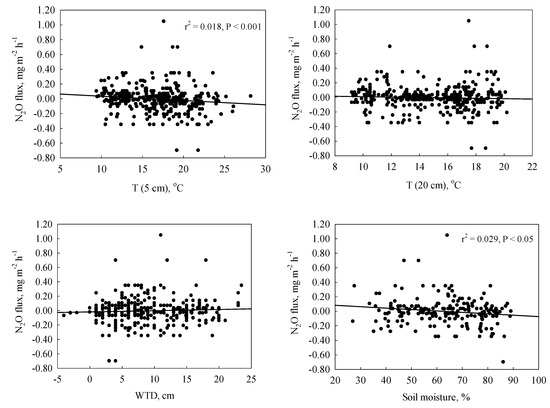 During the two growing seasons, we found a significant relationship between N2O flux and soil temperature at a 0.05 m depth and soil moisture at a 0.05 m depth, indicating that the important processes controlling the N2O fluxes take place at the surface layer of the peat. This is consistent with other studies in boreal peatlands, which have shown that the most important layer for N2O production or consumption is the topmost soil layer [13,24,32].