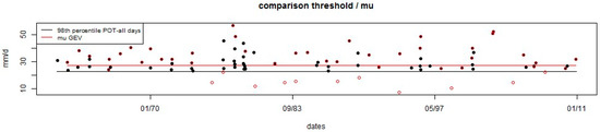 In order to further analyze this exception, Figure 3 shows the GEV/POT comparison for this gauge (vlm) in winter. Looking at the top figure, one observes that the frequency of threshold exceedances has decreased over the last decade, and the last values are lower than the rest. Considering the red points for GEV in greater detail, one sees that, as one maximum is chosen for each season, high and low values are mixed, some of them being lower than the POT threshold. The shape parameter is different: ξ = 0 for POT and ξ = −0.2845 for GEV. In this latter case, the distribution is strongly bounded, which is surprising for precipitation. Since sigma measures the variability, the scale parameter is greater in GEV because the maximum is more variable than in POT when choosing such low values as the maximum (a season with less than 10 mm of rainfall is not really a maximum). The estimates were made as if the time series were stationary, which is probably not the case and may further explain the differences.