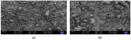 The surface morphology of the resins was examined using SEM-SE (JSM-7500F, Waltham, MA, USA) at a working distance of 8.1 mm at a thickness of 10 µm taken at different magnifications (Figure 4a–f). The micrographs of GTR and BTR have a porous, homogeneous, and crystallite morphology different from the broad heterogeneous surface of STR (Table 1).