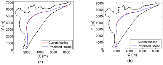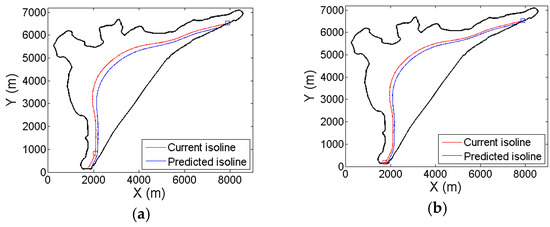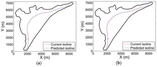 Advancement inland of the 100 m contour line of the seawater/freshwater interface with respect to sea level rise and years: (a) 4 mm per year; (b) 6 mm per year.