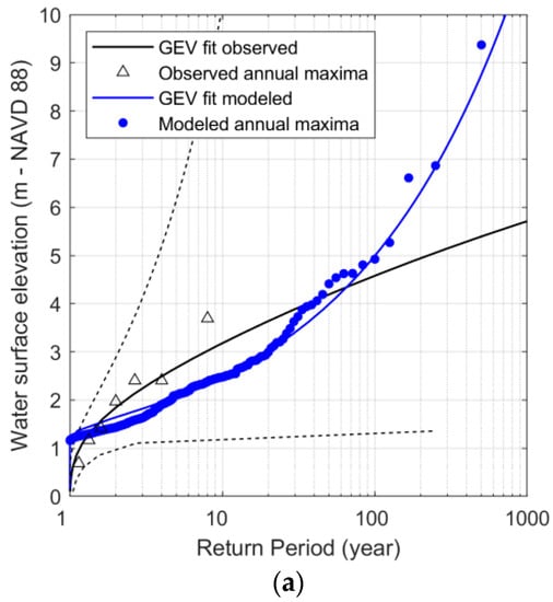 We further focus on extreme water levels and characterize flood hazard at any location in the model domain by constructing annual exceedance probability curve from the modeled daily water surface elevations. We define the modeled ‘annual maxima’ of the water surface elevations by randomly separating the modeled water levels at each river calculation point into 500 bins of 365 days and extracting the maximum of each bin. By doing so, we assume the extreme modeled daily water surface elevations in the series to be independent of each other, which may lead to an overestimation of the flood level for a given annual exceedance probability. We compare our results at three locations along the river where observed annual maxima of water levels are present. Two stations, HM and HTB, are located close to each other in the Port of Houston, while the third station HBB, is located upstream. The exact location of the stations is indicated in Figure 1 and Figure 4. A GEV distribution is fitted to both the observed and modeled annual maxima data series, a commonly applied statistical distribution for the quantification of the probabilities of extreme water levels maxima [81,82,83].
