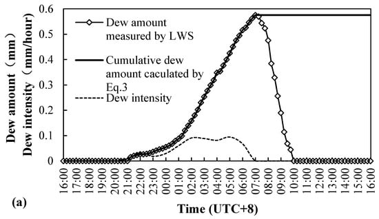 As shown in Figure 6b, dew was mainly produced between 17:00 and 7:00 in spring and autumn (the rising periods in Figure 6a) with the highest dew intensity of 0.013 mm/hour between 21:00 and 6:00. In summer, dew was mainly accumulated from 21:00 to 6:00 with the highest intensity of 0.012 mm/hour occurring only at 4:00. In winter, the dew intensity was maintained at much lower values below 0.003 mm/hour for a longer period from 18:00 to 8:00.