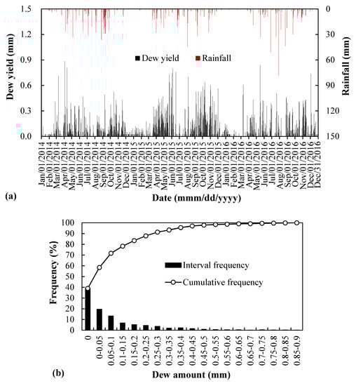 (a) Dew is a significant water resource in the semi-arid region due to its high frequency. Compared with rainfall, the number of dew days was 2.6 times the number of rain days. The annual total dew amount was 32.8 mm on average, which is about 1/18th of the total amount of rainfall.