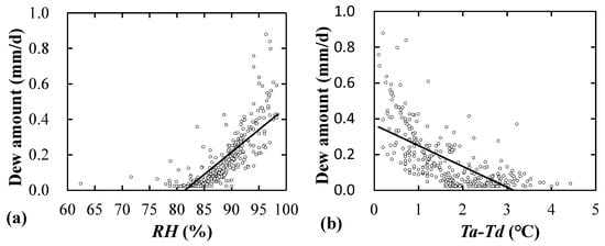 Figure 10a shows the correlation between dew amount and relative humidity (RH). A strong positive and significant correlation exists between dew amount and RH (r = 0.78, p < 0.01). The line is a linear fit to