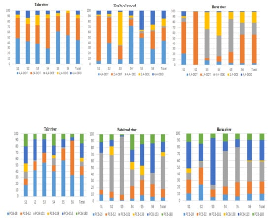 Average percent composition of DDT metabolites and PCB congeners in water samples from different sites (S1–S6) and sum of all sites on the Talar, Babolrood and Haraz Rivers in Iran.