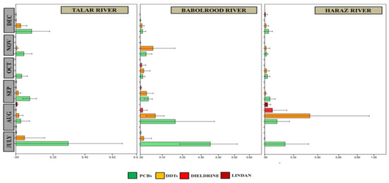 The OCP residues quantified from Talar, Babolrood and Haraz Rivers are given in Table 1, Table 2 and Table 3. The concentrations of DDT, dieldrin and lindane in Haraz River were significantly different (p < 0.05) from other rivers. Interestingly, around this river there is intensive agricultural and aquaculture activity. It has been observed that water bodies near such intensive agricultural areas tend to be contaminated due to the application of agricultural pesticides [,]. Among the three detected pesticides DDT, lindane and dieldrin, the mean concentration of DDT was significantly (p < 0.05) higher than lindane and dieldrin (Table 1, Table 2 and Table 3). The mean concentrations of DDTs, lindane and dieldrin are shown in Table 1, Table 2 and Table 3.